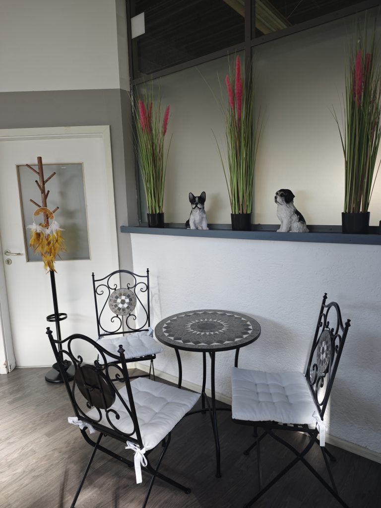 Aufenthaltsraum ist die zweite Glastür auf der rechten Seite. Dort stehen Tische, Stühle, sowie Kaffeemaschine
